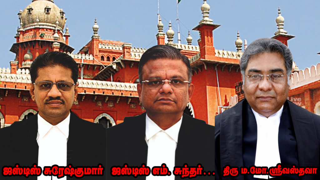 வாஞ்சிநாதன்: ஆமா. இப்ப இப்படி இருக்கற சூழ்நிலையில இப்ப மெட்ராஸ் High Court எடுத்துக்குவோம். சென்னை உயர்நீதிமன்றத்தில இன்னைக்கு இப்போதைய தலைமை நீதிபதி வந்ததிலிருந்து உள்ள பிரச்சனையை பார்ப்போம். இப்போதைய தலைமை நீதிபதி ராஜஸ்தான் ஹைகோர்ட்ல இருந்து 21.07.2025-ல மெட்ராஸ் ஹைகோர்ட்டுக்கு வராரு. அவர் பேர் திரு மணீந்திர மோகன் ஸ்ரீவஸ்தவா. அவர் வரும்போது ஜஸ்டிஸ் ஆர். சுப்பிரமணியம் இரண்டாவது ஜட்ஜா இருக்காரு. ஜஸ்டிஸ் எம். சுந்தர் மூணாவது ஜட்ஜா இருக்காரு. இவங்கதான் கொலிஜியம்.