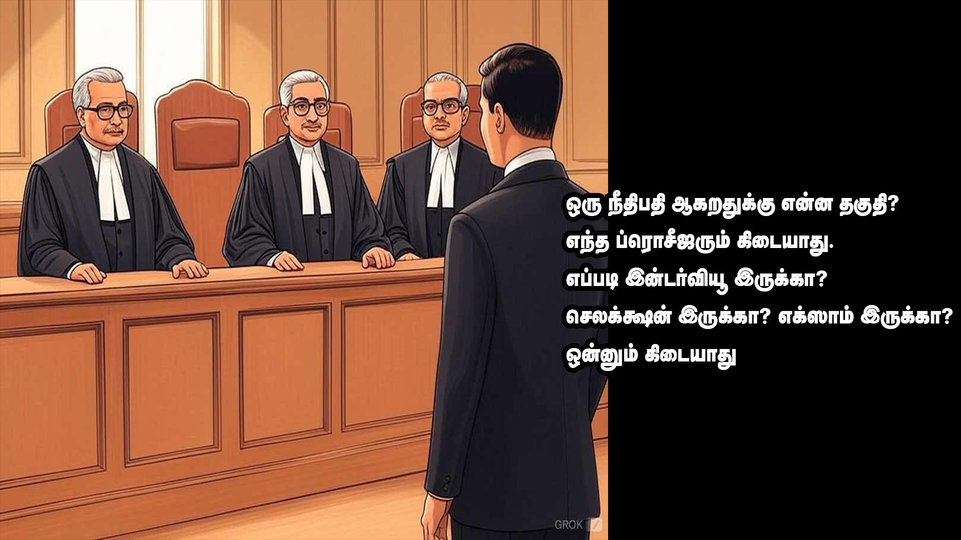 “எந்தப்ரொசீஜரும் கிடையாது. ஒரு நீதிபதி ஆகறதுக்கு என்ன தகுதி? எப்படி இன்டர்வியூ இருக்கா? செலக்க்ஷன் இருக்கா? எக்ஸாம் இருக்கா?