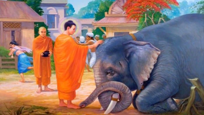 புத்தரின் தாயாகிய மாயா தேவி அவரை கருவுற்றிருந்த காலத்தில் வெள்ளை யானையை கனவில் கண்டாராம். அதனால் யானை புத்தரின் வடிவமாகவே பார்க்கப்படுகிறது. மேலும் பௌத்தத்தில், யானை புத்தரின் ஞானத்தையும், தர்மத்தைப் பரப்புவதற்கான பலத்தையும் குறிக்கிறது. தென் ஆசியாவில் உள்ள பல பௌத்த கோவில்களில் யானையின் சிற்பங்கள் மற்றும் ஓவியங்கள் காணப்படுகின்றன. இவை புத்தரின் வாழ்க்கை சம்பவங்களை அல்லது பௌத்தக் கதைகளை சித்தரிக்கின்றன.